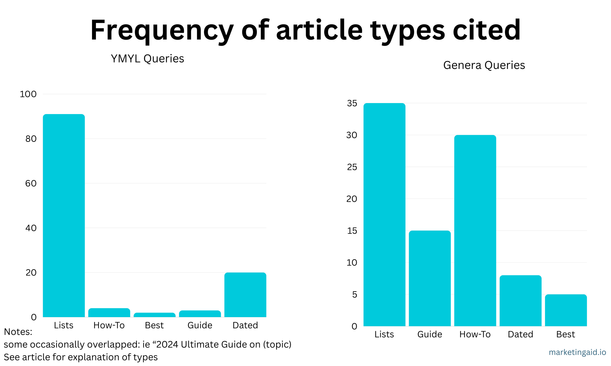 For YMYL related queries I found that the vast majority of articles cited contained lists and that the second pattern I saw was that more had the date in the title. There were very low incidences of how-to style posts, or guide keywords in these query types.