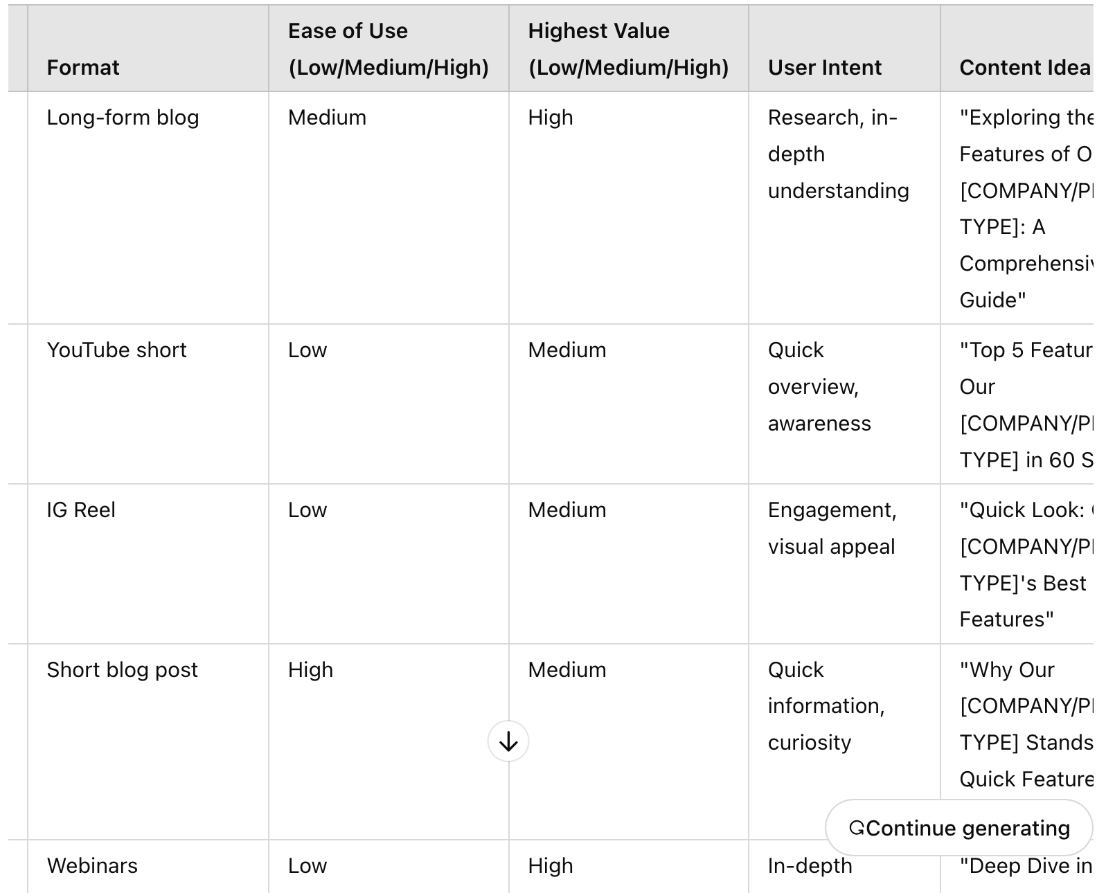 Why: This will allow you to get a full content calendar with ideas on what different formats of content can be created based on the type of content you need to create, and you can then repurpose this across platforms.