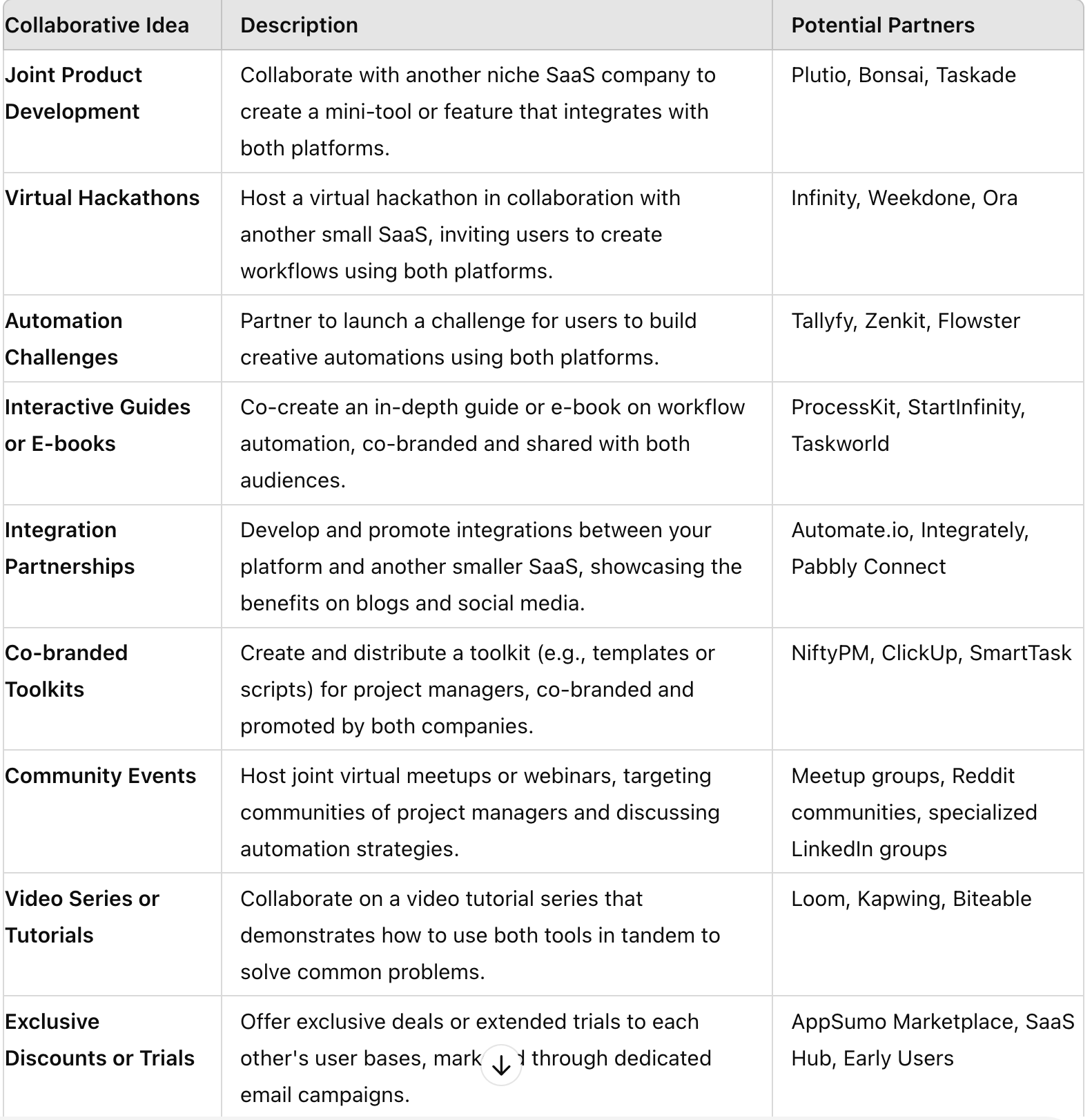 Add examples of similar, but not competing, companies we can partner with. Make sure the companies are ones that I can realistically partner with as a business of (business size)