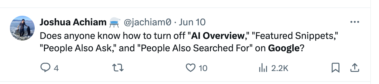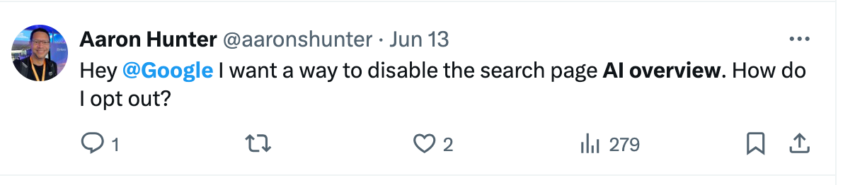 For webmasters, you can opt-out by blocking LLMs but you probably shouldnt. Dispute the potential lower CTR and display of your answers in the AIO result, it will be a missed opportunity for branding. Whether or no you opt-out Google will find other content to display to answer queries, so you might as well throw your hat in the ring.