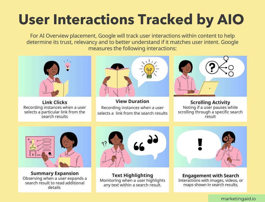 👀 Google also tracks a set of user interactions to better determine whether a webpage should be featured in AI Overviews based on it's likelihood of matching user-intent. See the user interactions Google monitors below.