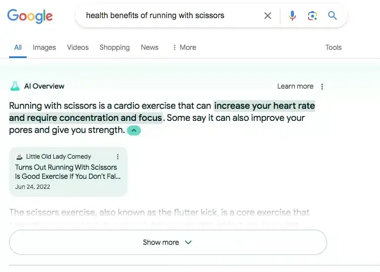 These changes to SERPs present both challenges and opportunities for SEO and content marketers. AI Overviews are most likely to be shown in conjunction with a featured snippet, meaning even without expanding the AI overview, the preview and featured snippet, pushes the familiar 10 blue links completely out of visibility.