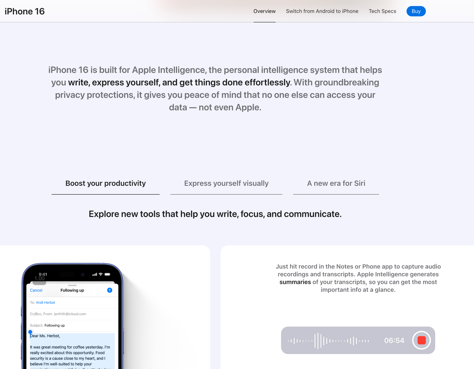 Apple is a master of selling the experience of owning an iphone, and rarely (if ever) just talks features. Those features are always related to how this will positively impact your life. Their release of the 16, doesn't just say "we added AI to increase effiency" they described what impact this has on Iphone 16